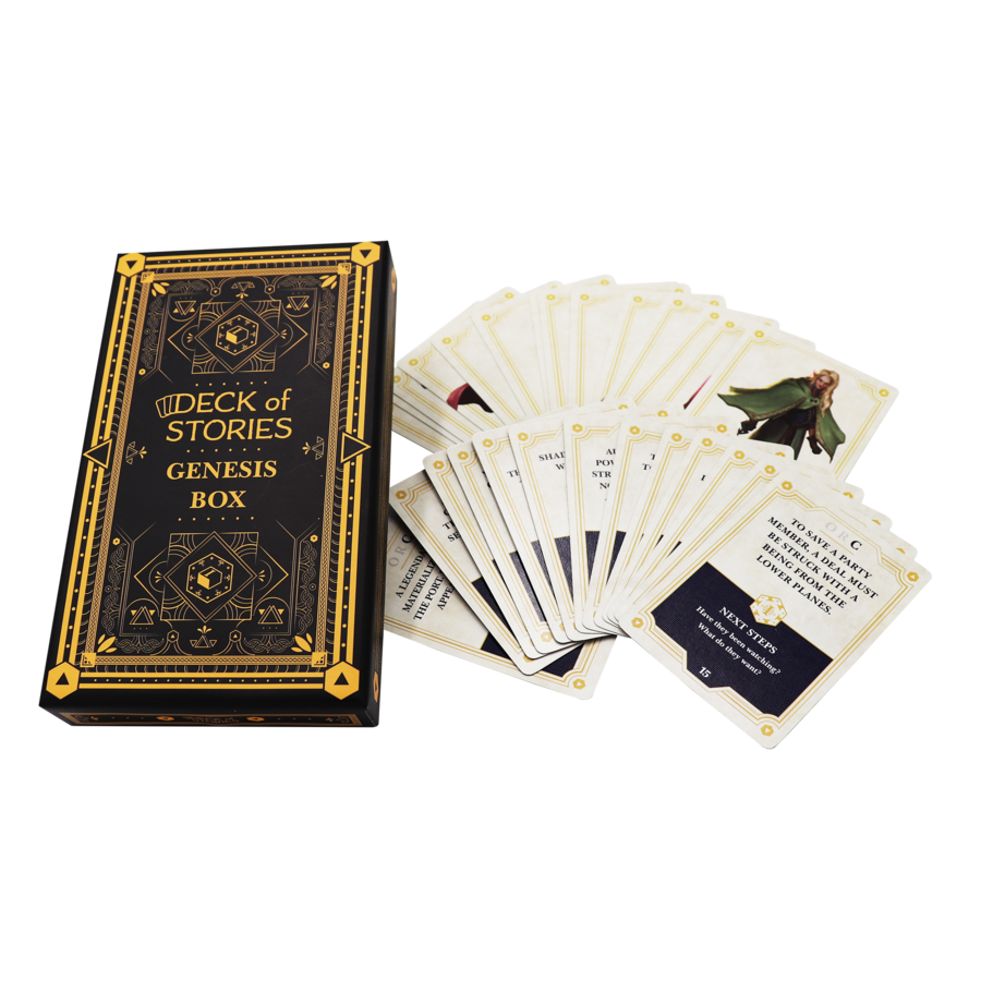 The Genesis Box contains a complete set of tools to help you build a legendary adventure in 15 minutes. Begin by choosing one story card to spark inspiration or combine several story cards to cover every moment within your story. Add more levels of complexity with sensory cards and engage the senses for a dynamic and memorable encounter. Finally, add NPC cards to round out your story with pregenerated, beautifully illustrated characters that fit seamlessly into your world.