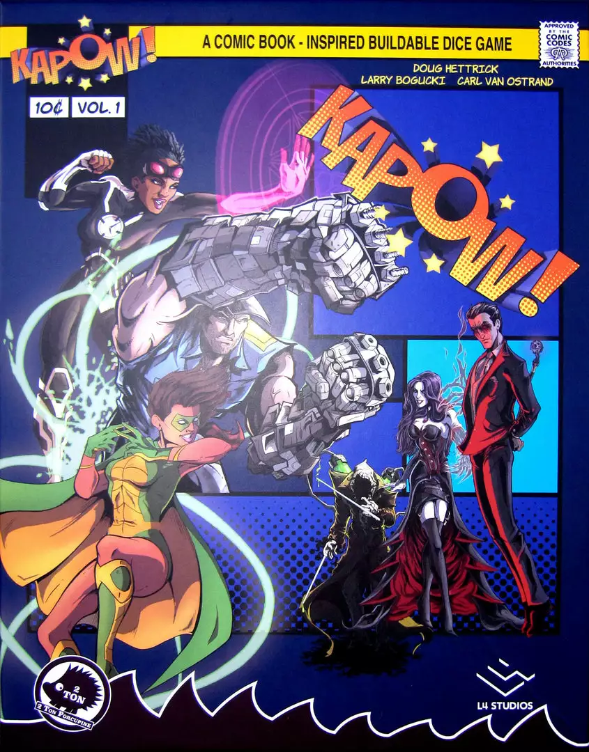 In Kapow!, players go head-to-head in a classic explosive clash of good vs. evil. Players choose to be a villain or hero (which determines your starting trait dice and unique abilities). Behind a player screen, the dice are rolled and then strategically allocated to attack, defense, and/or power up abilities. Players must decide how to build their dice pool and how to use rolls in the most effective way possible. The fun is fast and furious — get ready to rumble in superhero style with Kapow!