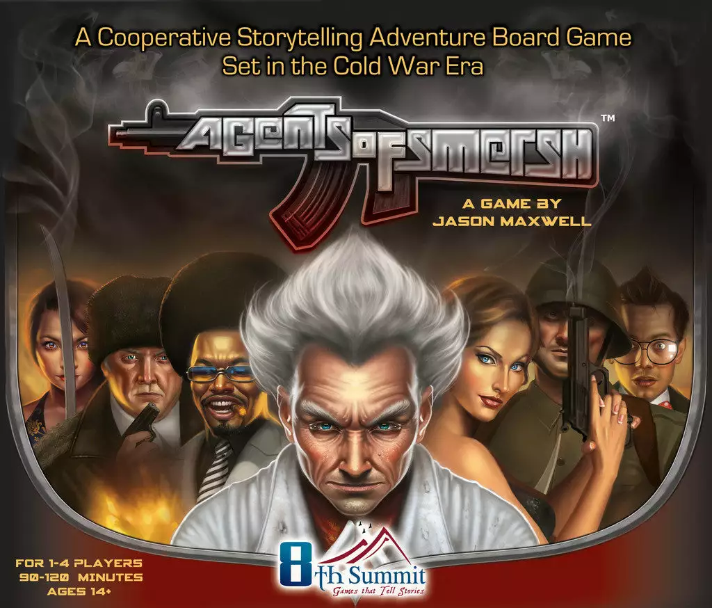 Agents of SMERSH is a cooperative Storytelling game that pits players as UN Secret Service Spies set in an alternate 1970s timeline against a newly formed and independent SMERSH. The game will be able to accommodate play with either The Encounter Book that contains over 1500 written encounters with a similar reaction matrix to Tales of the Arabian Nights – or played more simply with only encounter cards with shorter encounters and no matrix. Agents of SMERSH includes custom dice to determine success or failure of encounters, and more strategic play from what is typically expected of a Storytelling board game. There are plenty of James Bond gadgets, guns, cars, pop references and detailed artwork – not to mention a touch of humor. The game features the artwork of George Patsouras (The Resistance & Flash Point).