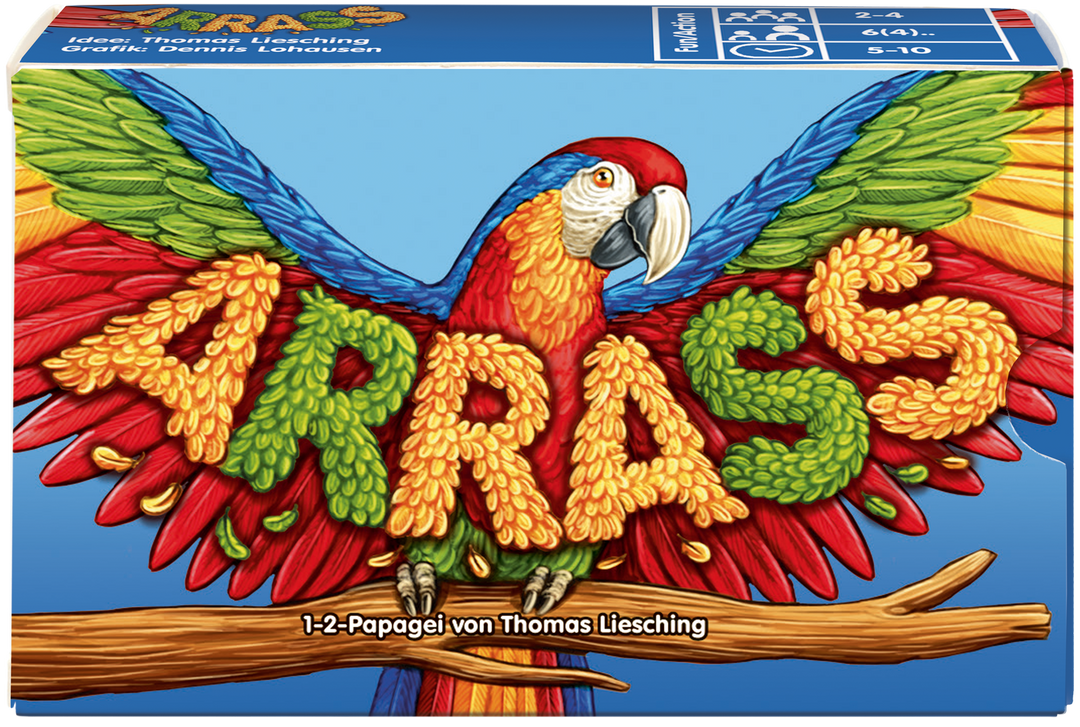 In Arrass, players quickly count how many parts of the parrot are the same on two revealed cards, then lay the appropriate number card down on the table as quickly as possible. The quickest player to lay down the right number card is awarded points, and the player with the most points wins.