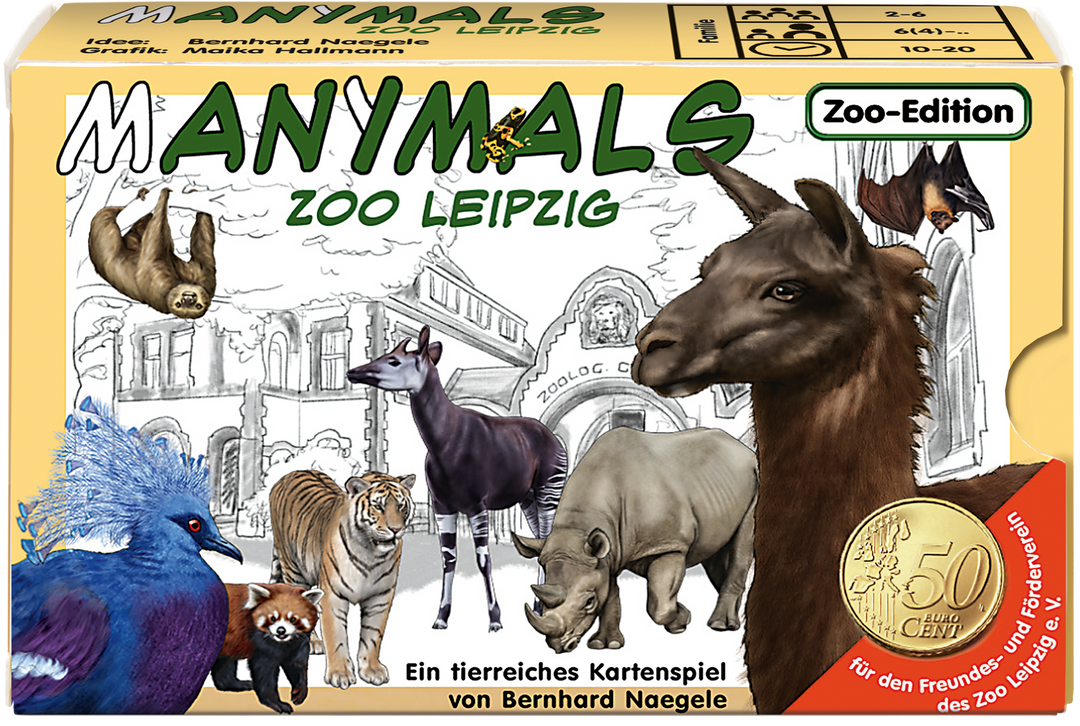 Manimals: Zoo Leipzig includes rule variants that allow for play with children as young as four, and for each copy of Manimals sold, Adlung-Spiele will donate fifty cents to “für den Freundes- und Förderverein des Zoo Leipzig e. V.” for animal protection.