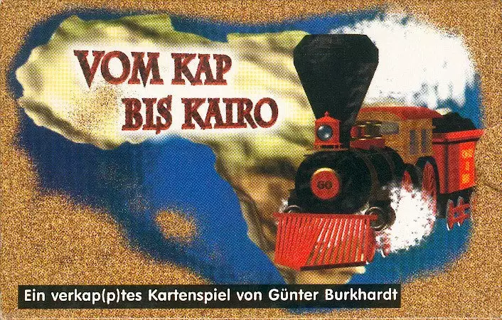 Players attempt to be the first to build a railway route from Cape to Cairo through various terrain types in Africa. Players begin with 100 pounds, which is used to bid on terrain cards and purchase missing tracks necessary to cross terrain. Each turn, a number of terrain cards equal to the number of players in the game are auctioned off and placed before the appropriate player’s train, representing the next space to be crossed. Terrain cards show a number of tracks ranging from 0 to 3 and require from 6 to 10 tracks to cross depending on the type of terrain. In turn order, players flip additional terrain cards, and decide whether to build (cross terrain) or pass. When a terrain is crossed, the card is flipped face down and the player who completed the crossing receives back a number of pounds as indicated on the card. The track-building phase continues until one player has no terrain cards lying in front of their train, at which time a new set of terrain cards are auctioned. The first player to complete the crossing over eight terrain segments is the winner.