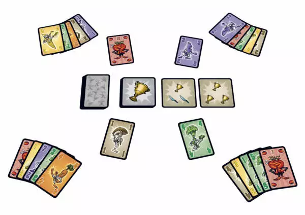 In Karate Tomate players are in a extraordinary culinary martial arts tournament. Learn from the “Tomato”, the great karate master, learning new fighting techniques and collecting the most trophies to win this game. But also collect enough kitchen knives to clear out enemy vegetables at the end of the game. Anyway, you should not be the player with the fewest knives! Then you lose – no matter how many trophies you have!