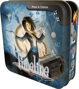 Timeline: Music & Cinema is a card game played using 110 cards. Each card depicts a historical event on both sides, with the year in which that event occurred on only one side. Players take turns placing a card from their hand in a row on the table. After placing the card, the player reveals the date on it. If the card was placed correctly with the date in chronological order with all other cards on the table, the card stays in place; otherwise the card is removed from play and the player takes another card from the deck.
