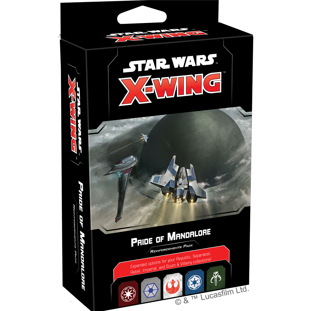 The Pride of Mandalore Reinforcements Pack includes new ship and upgrade cards for Star Wars: X- Wing, allowing players to pilot their existing ships with new characters seen in The Mandalorian, Star Wars: The Clone Wars and Star Wars: Rebels. In addition to new pilots and upgrade cards useable by five factions; new tokens and obstacles are also included. Finally, the reinforcements pack also contains dials and ship tokens to convert the Fang Fighter over to the Rebel Alliance!