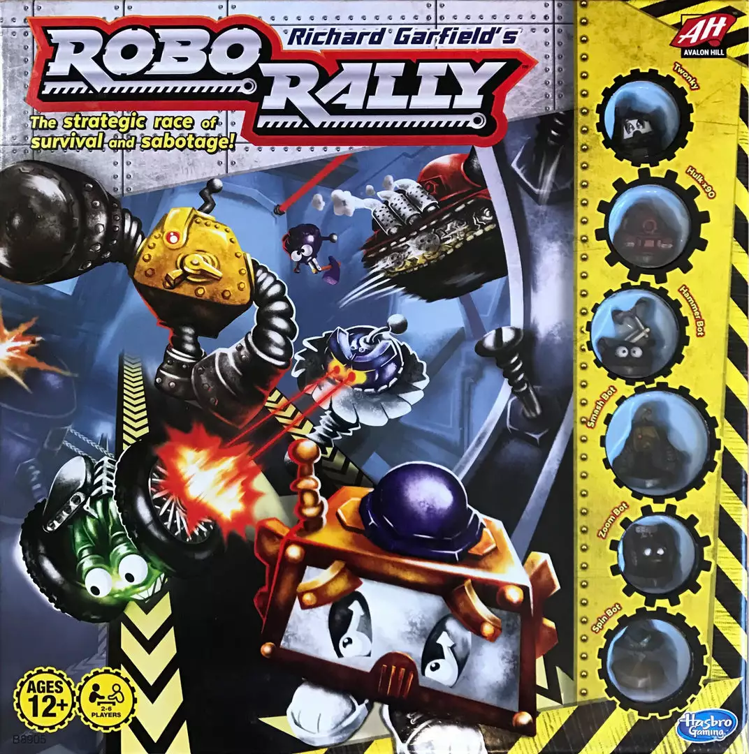 Enter the world of mad machines and dangerous schemes in the Robo Rally board game. Players control their robot with game cards which reveal directions on how the robots can move through the hectic Robo Rally automobile factory. Use strategy to outsmart rival robots while racing towards each checkpoint in your chosen course in numerical order. Beware of factory obstacles such as industrial lasers, gaping pits, and moving conveyer belts that can make or break the race.