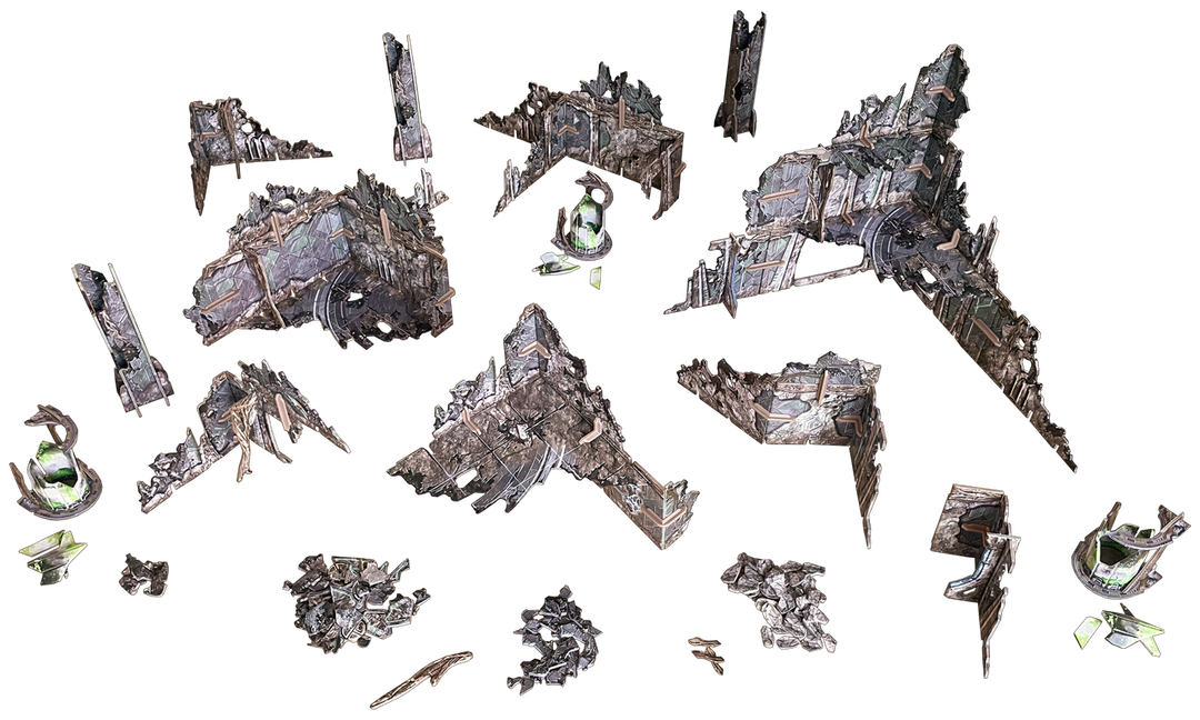 The terrain is supplied flat-packed on high-quality, high-density card, printed in full colour on both sides, so no painting required! The terrain requires assembly, and some smaller parts will require glue. This is identical to the alien ruins supplied with the Trader Encampment terrain set.