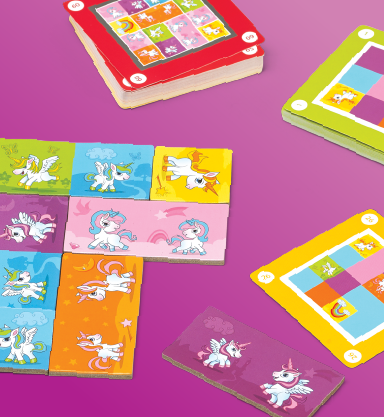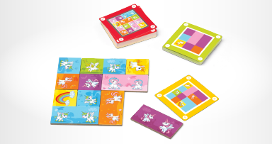 The Mindo Collection consists of 4 clever puzzles; can you collect and master them all? Play solo, or combine them and race your friends. No matter which version you choose the rules are the same: turn and flip the double-sided tiles until you have recreated the color pattern on the challenge card. They only fit one way into a 3×3 or 4×4 grid, so think and plan carefully. 60 different challenge cards and 4 levels of difficulty ensure hours of brain teasing fun!