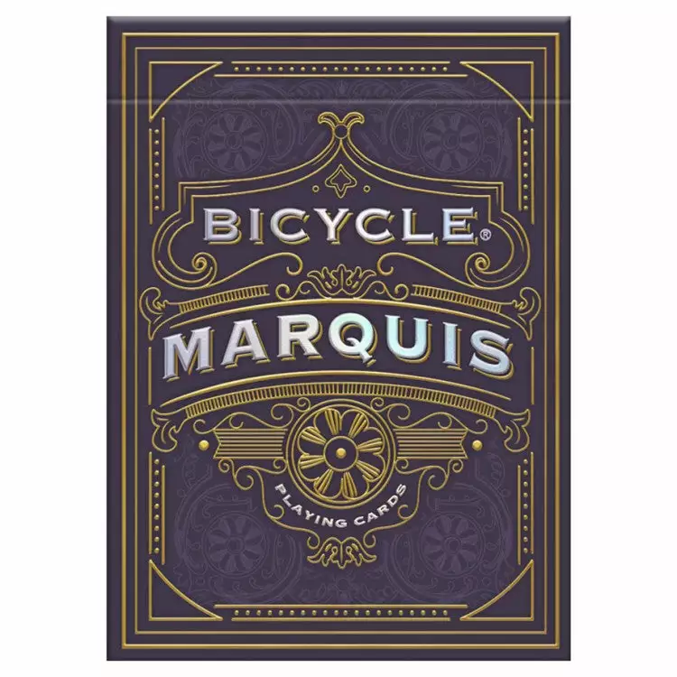 Bicycle® Marquis playing cards bring class and sophistication to your favorite card game or collection. The Marquis deck features a restored card back from Andrew Doughtery’s Cruiser No. 96 deck that was first printed in the early 1900s. The card faces were inspired by the New Era playing cards, first printed by USPCC in 1896. The intricate tuck case design features elements from the historic card back highlighted with premium foil accents in two colors. Printed on premium Bicycle® brand card stock with Air-Cushion® Finish, these cards shuffle and handle perfectly with the quality and performance you expect from the Bicycle brand.