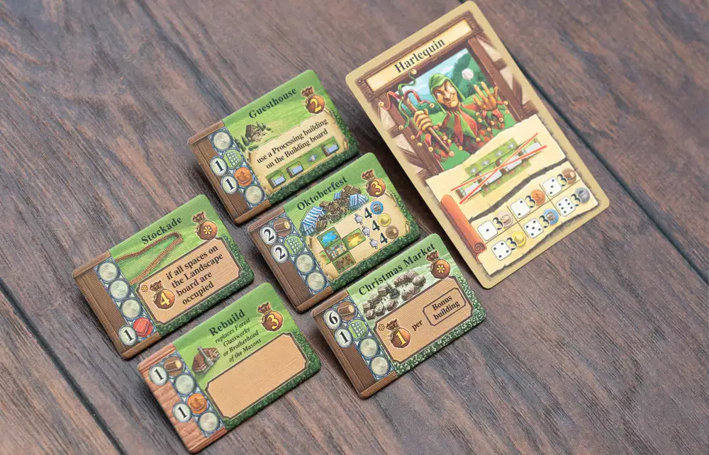 The game consists of four building periods. Each player has an identical set of fifteen specialist cards, and each specialist comes with two abilities. At the beginning of each building period, each player needs to choose a hand of five specialists. If he then plays a specialist that no other player has remaining in his hand, he may use both abilities of that card; if two or more players play the same specialist, each of them may use only one of the two abilities. Exploiting the abilities of the specialists lets you collect resources, lay out new landscape tiles (e.g., ponds and pits), and build a variety of buildings. There are three types of buildings: