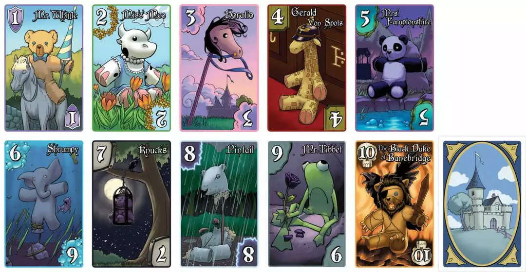 The Princess and Mister Whiffle is a strange book by Patrick Rothfuss and Nate Taylor. It is illustrated in the style of a children’s book, but it’s certainly not for children. This limited-edition Pairs deck draws on characters and themes from that book, with whimsical yet dark imagery. The rules also contain a bonus game, called Kitty.Â