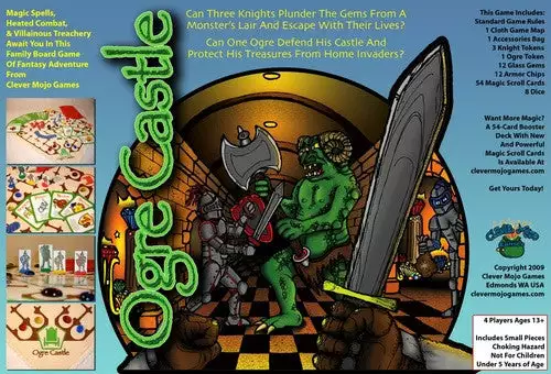 A game of greedy invading Knights and an Ogre protecting its turf and treasure. In Ogre Castle, three players become knights invading a castle in search of treasure, while a fourth player becomes the Ogre, owner of the castle and the treasure. The Ogre seeks to repel these home invaders and save its goods through magic and sword-play.