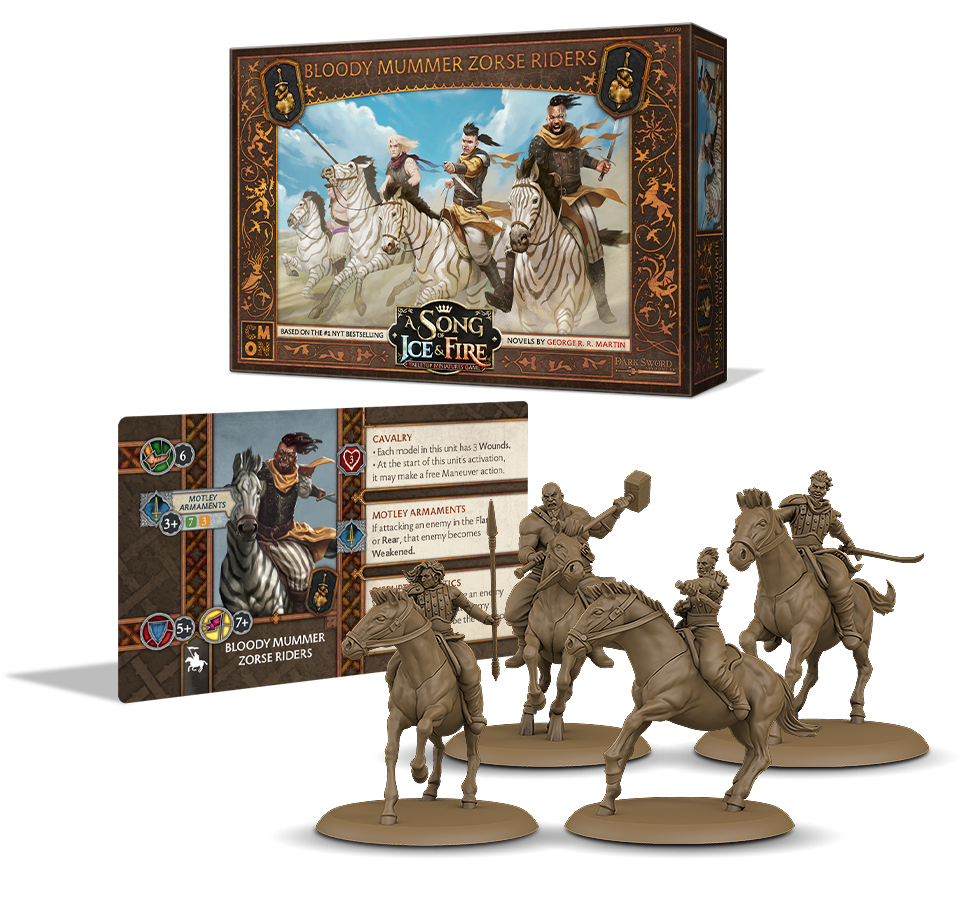 The Bloody Mummers Zorse Riders unit box for the A Song of Ice and Fire: Tabletop Miniatures Game gives commanders a bright new cavalry unit to use in combat. Being a Neutral unit, they can be taken by most commanders. The Zorse Riders are masters at flanking maneuvers. When catching an enemy in the side or rear, they get several different bonuses, both offensively and defensively, potentially ruining an enemy’s plans before they even begin.