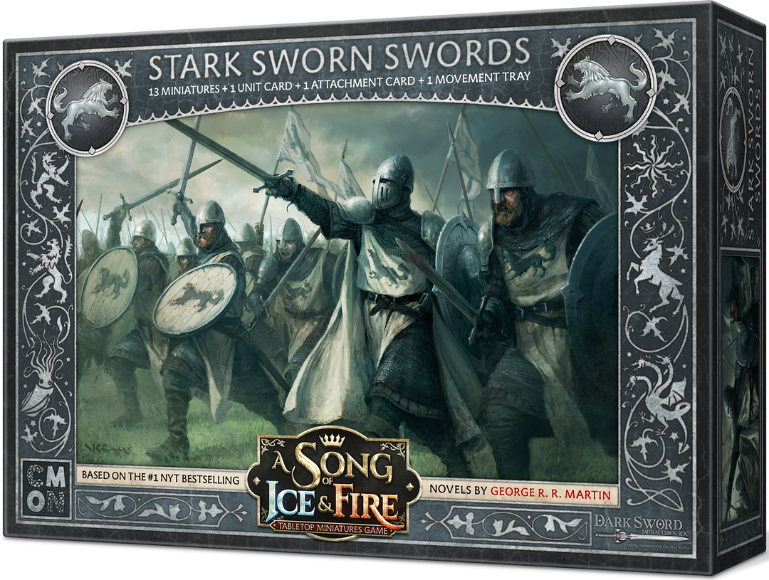 The A Song of Ice & Fire: Tabletop Miniatures Game – Stark Sworn Swords unit box contains twelve miniature sworn sword figures, one sworn sword unit attachment, a movement tray, and all associated unit cards. These warriors have waited in the frozen north too long, dreaming of battle. They may not be the best equipped units in the war, but they know that shiny armor and pretty swords alone do not make a soldier.