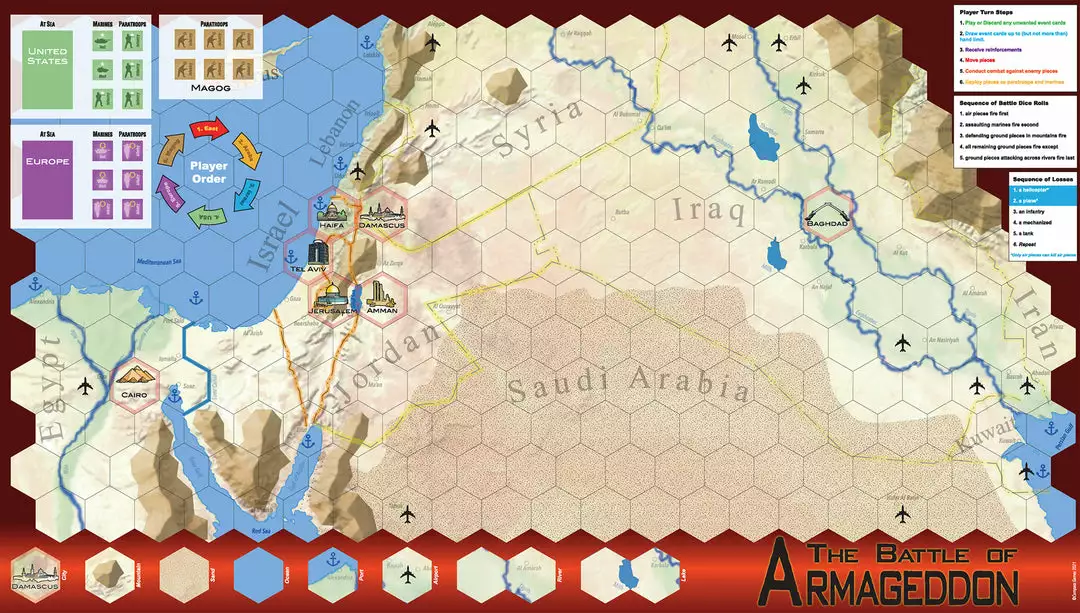 The 19 x 33″ game map represents the battleground, stretching from Egypt to Iran. The 216 5/8″ counters (die-cut and back-printed) represent the armies of Israel, the Arabs, Magog (Russia), the Revived Roman Empire (Europe), USA and the Kings of the East (China). The 149 playing cards capture apocalyptic events (7 seals, 7 trumpets, 7 vials), special powers (e.g. the Anitchrist, Gog of Magog, etc.), nuclear weapons (tactical, theatre, and strategic) and homeland populations. Battle dice are used to resolve all battles.