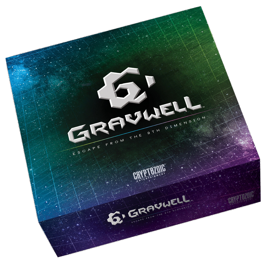 In Gravwell: Escape from the 9th Dimension, players command spaceships that have been pulled through a black hole, transporting them into a different dimension. With each ship lacking fuel to get home, each player must collect basic elements from surrounding asteroids, using the gravity of the dimension and what little resources they have in order to reach the warp gate that will take them home. But in this dimension, moving ships will travel towards the nearest object, which is usually another ship, and when those objects are moving either forward or backward, reaching the warp gate isn’t always easy. Time is running out to save your crew and your ship! As a grim reminder of the cost of failing to escape, the frozen hulks of dead spacecraft litter the escape route – but with careful cardplay, you can slingshot past these derelict craft and be the first to escape from the Gravwell!