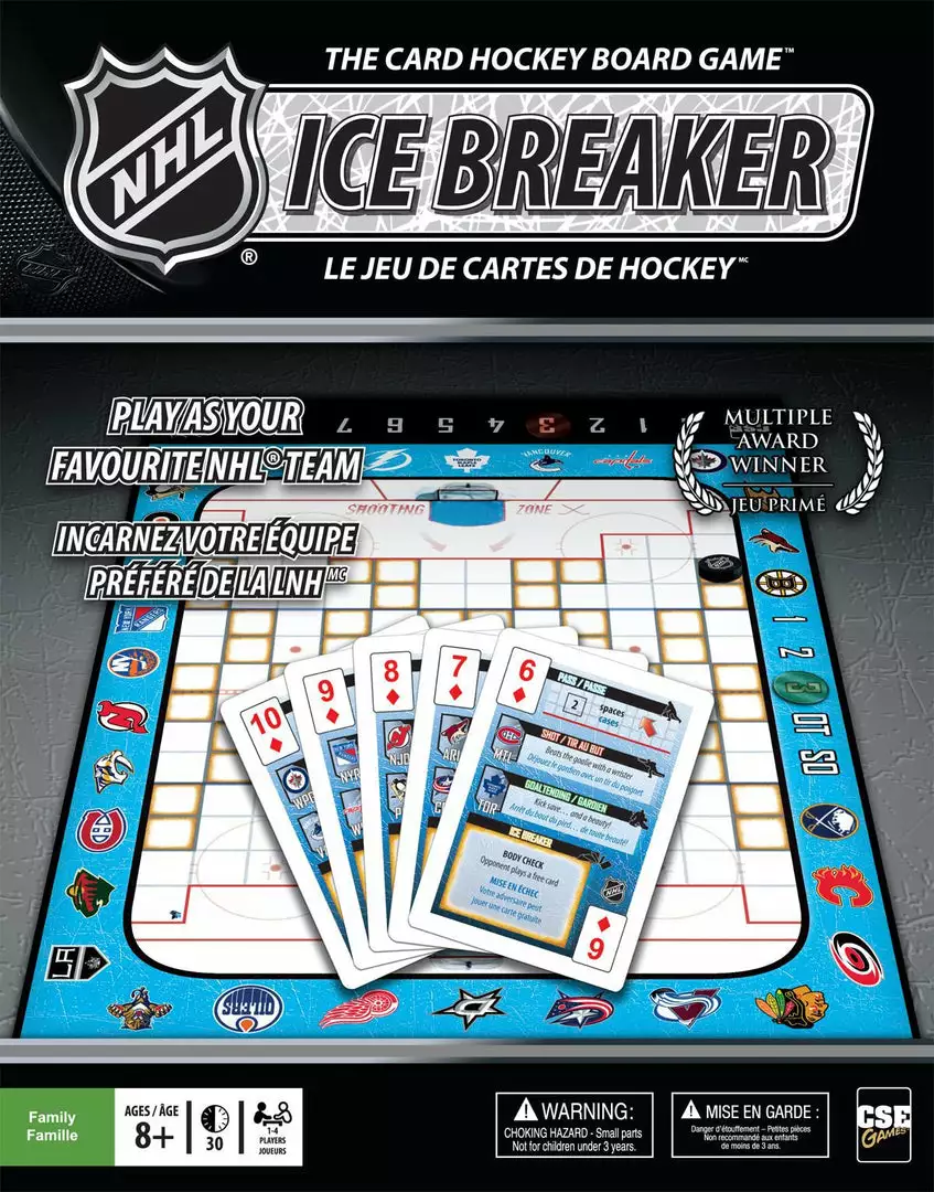 NHL Ice Breaker is licensed by the National Hockey League and features the league’s 30 teams plus national teams. You get all the great action of the game on the ice with NHL Ice Breaker. Game play is built around CSE Games’ specially-designed 54-card playing deck (52 standard suited cards plus two Jokers). Each action in NHL Ice Breaker is based on the basic principle of high hand wins. Opponents play their card(s) at the same time to battle for puck possession, and the player with the highest hand gets to execute his/her action indicated on the card(s) played.