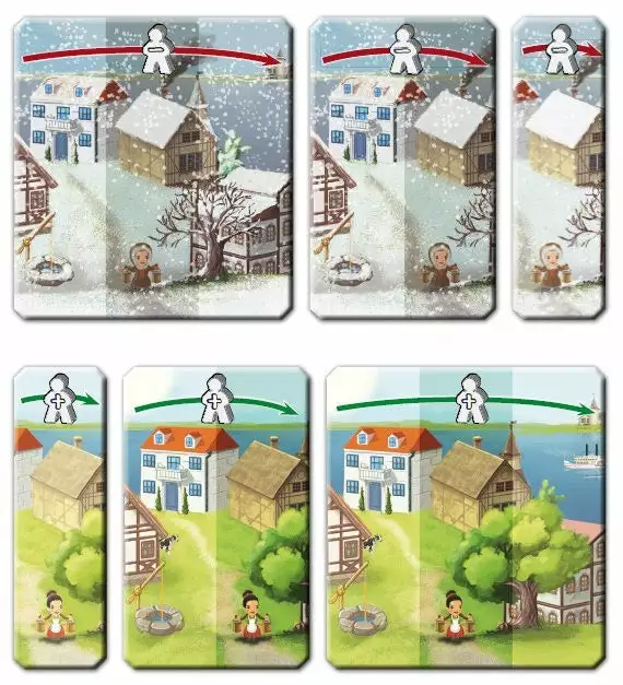 One winter and one summer tile side (randomly determined) become part of the timetrack, with the winter tile placed between December and January and the summer tile between June and July. These tiles limit the options in winter and in summertime, and in the winter work is harder (more strength needed) while during the summer lighter (less strength needed).