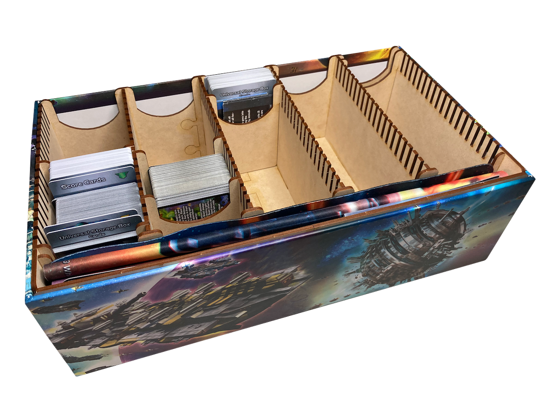 Our storage solution for the Star Realms Universal Storage Box takes a great start and makes it even better. Our solution offers 895mm of card storage in five lanes and stores a play mat.