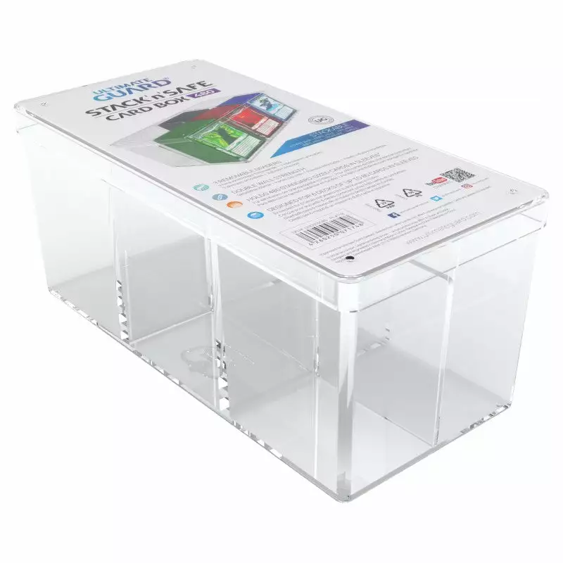 High quality stackable card box, made of clear polystyrene. Holds up to 480 standard-sized cards (e.g. Magic the Gathering, Pokemon and others ) in sleeves.