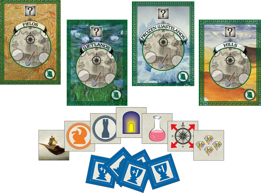 During the game, one Treasure Map card is always visible as an Open Quest for any player to fulfill. To fulfill a Treasure Map Quest, a player must travel to the Region showing on the Treasure Map and dig there (using his “Dig Dog”). On doing this, the player claims one +1 Point Bonus Token and one Mystery Token (see below). The Treasure Map card is discarded face-up at the bottom of the Treasure Map deck and a new Treasure Map card is displayed on top (reshuffle as needed).