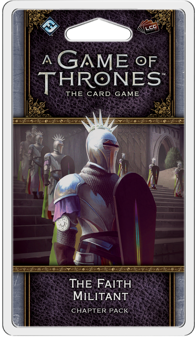 The Faith Militant is the fifth Chapter Pack in the “Flight of Crows” cycle for A Game of Thrones: The Card Game, and it introduces a special focus on the religions of Westeros, even when viewed alongside the other Chapter Packs of the cycle. Here, you’ll find characters who’ve sworn fealty to The Seven, the Drowned God, and R’hllor, each serving their gods with the utmost fervor. With iconic characters like Arya Stark, Daenerys Targaryen, and Coldhands appearing in this expansion alongside a new agenda focused on The Seven, it’s plain to see that the Seven Kingdoms will never be the same again.