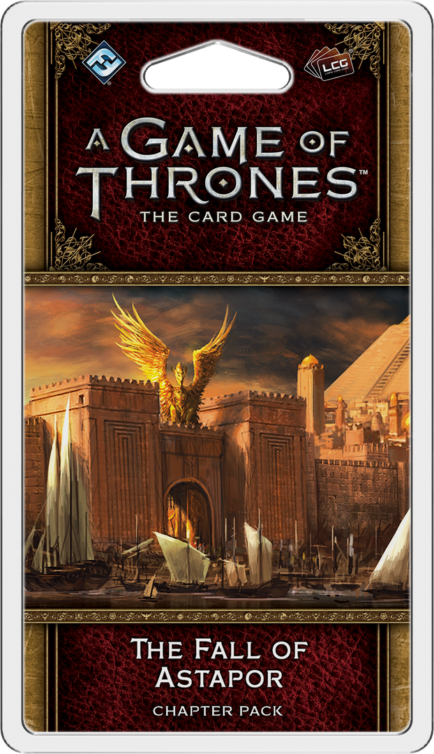Bloody plots consume the Seven Kingdoms as Daenerys Targaryen liberates Astapor in the manner of Old Valyria — with fire and blood! The Fall of Astapor is the third Chapter Pack in the “Blood and Gold” cycle for A Game of Thrones: The Card Game, continuing the saga of A Song of Ice and Fire into A Storm of Swords. Within this pack, you’ll find more cards focusing on the new bestow keyword, powerful new economy, and the subtly growing influence of House Frey. You’ll even have the chance to add iconic characters and locations to your deck, including Grey Worm, The Twins, and Theon Greyjoy.