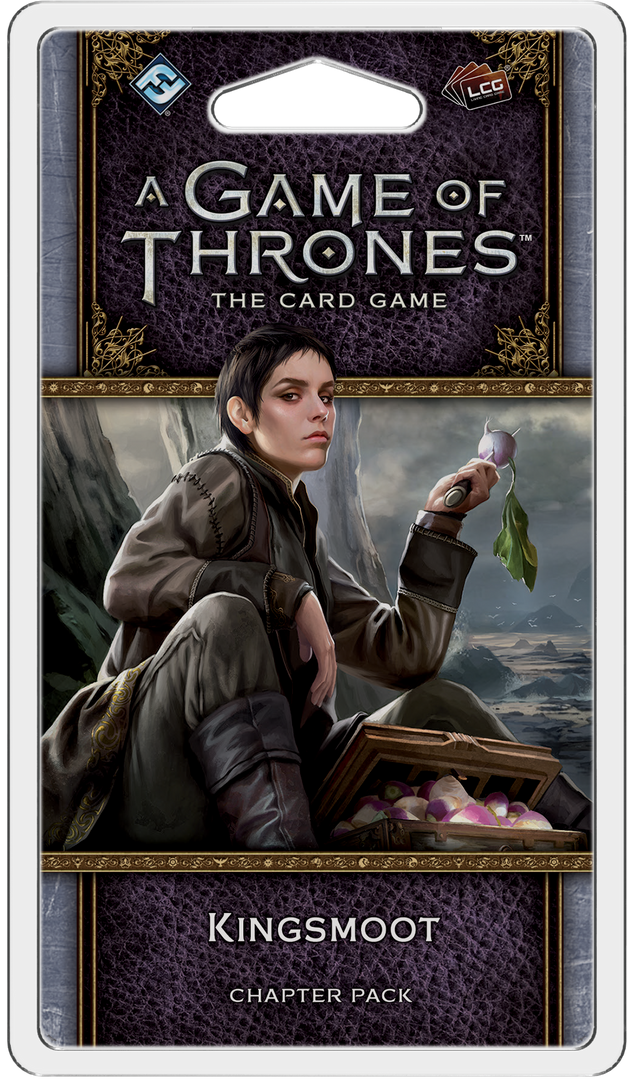 In the tradition of the other Chapter Packs of the “Flight of Crows” cycle, Kingsmoot contains sixty new cards, offering brand-new characters, locations, attachments, and events for the eight factions of A Game of Thrones: The Card Game. As the story of the cycle continues to follow A Feast for Crows, you’ll see characters like Ramsay Snow, Raff the Sweetling, Jhiqui, and Darkstar entering the game, alongside two new neutral Brotherhood characters. As the bestow keyword gains strength, other cards reward you for forging alliances between factions — but no matter who you fight for, you’ll find the cards you need at the Kingsmoot!