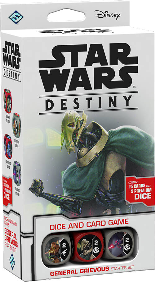Travel back to the time of the Clone Wars with the General Grievous Starter Set for Star Wars: Destiny! Take control of General Grievous and two terrifying Commando Droids as you take on the forces of the Old Republic! With twenty-four cards and nine dice, the General Grievous Starter Set contains everything you need to fulfill your destiny!