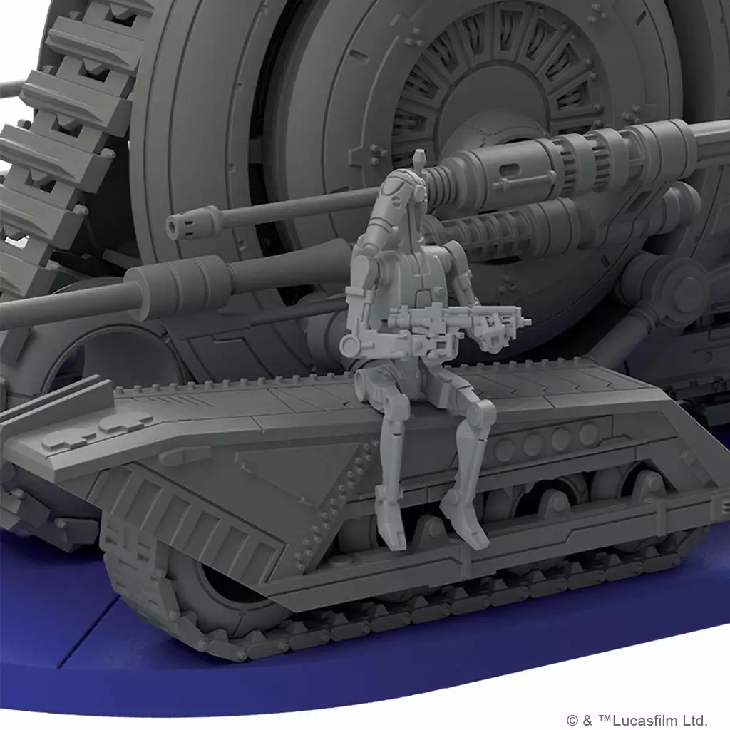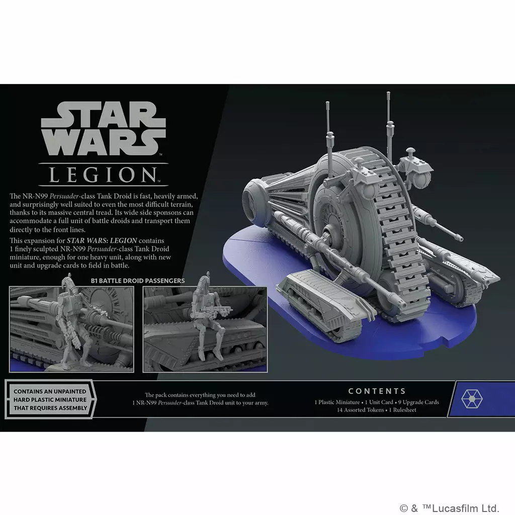 Lead the assault with the NR-N99 Persuader-class Tank Droid Unit Expansion for Star Wars: Legion! This fast, heavily armed tank droid is surprisingly well suited to even the most difficult terrain thanks to its massive central tread. Its wide side sponsons can accommodate a full unit of battle droids and transport them directly to the front lines.