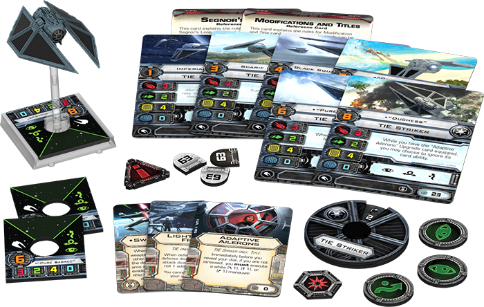 The sleek and agile TIE striker was developed primarily by Imperial forces stationed on planetary installations, where its adaptive ailerons and potent weaponry made it an excellent safeguard against Rebel incursions. The TIE striker and its adaptive ailerons come to life with the TIE Striker Expansion Pack for X-Wing. It contains one highly detailed and pre-painted miniature TIE striker, along with six ship cards and three upgrades. These reflect the ship’s exceptional atmospheric maneuverability, as well as its use in Imperial swarm tactics.