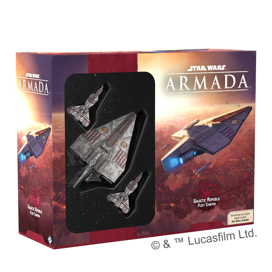 This Fleet Starter lays the foundation for your Galactic Republic fleets by putting you in command of a mighty Acclamator-class Assault ship and two powerful Consular-class Cruiser miniatures. These ships are joined by four squadrons of V-19 Torrent Starfighters flown by crack clone pilots ready to defend the fleet. Additionally, 20 upgrade cards invite you to customize every aspect of your ships with iconic officers and powerful weapons.
