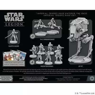Your players can begin building their invincible Imperial armies and jump into the battles of Star Wars: Legion with this Battle Force! Carrying out the orders of Darth Vader himself, the renowned Blizzard Force crushed the Rebel resistance on Hoth and this Battle Force puts everything players need to construct and play their own Galactic Empire armies at their fingertips, including the commander version of Darth Vader from the Star Wars: Legion Core Set, three units of Imperial Snowtroopers, an AT-ST, a unit of 74-Z Speeder Bikes, and a new Stormtrooper Heavy Response Unit. In addition to these units, players will also find a complete set of basic command cards, reprints of Darth Vader’s three command cards from the Star Wars: Legion Core Set, and three new command cards representing the tactics used by the Imperial forces on Hoth for use exclusively by Blizzard Force. Rounding out this set are 26 reprinted upgrade cards that give aspiring Imperial commanders everything they need to outfit their Battle Force and crush all those that stand in their way.