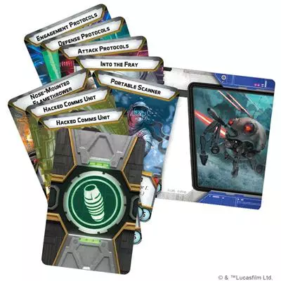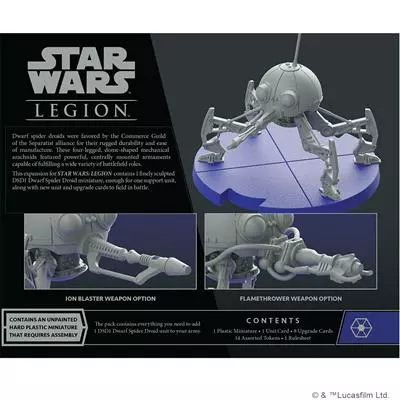 Within this expansion, you’ll find everything you need to add a DSD1 Dwarf Spider Droid to your Separatist armies as a support unit. This droids versatile nature is captured in the finely detailed, unpainted hard plastic miniature that can be customized with a nose-mounted laser cannon, flamethrower, or ion blaster. These physical modifications have a practical application in eight upgrade cards that invite you to outfit your DSD1 Dwarf Spider Droid with a variety of weapons and battle protocols.