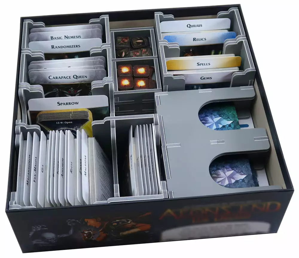 Insert compatible with Aeon’s End®, and includes space for numerous expansions, storing 840 sleeved or 1,300 unsleeved cards. Insert is also compatible with the Aeon’s End: War Eternal®, Aeon’s End: The New Age®, and Aeon’s End: Outcasts® games. The design provides both efficient storage and improved game play. Many of the trays can be utilised during the game, and they greatly aid set-up and clear-away times. The rules act as a lid on top of the trays. When used with the Pegasus Spiele edition of Aeon’s End: The New Age® the trays are assembled slightly differently.