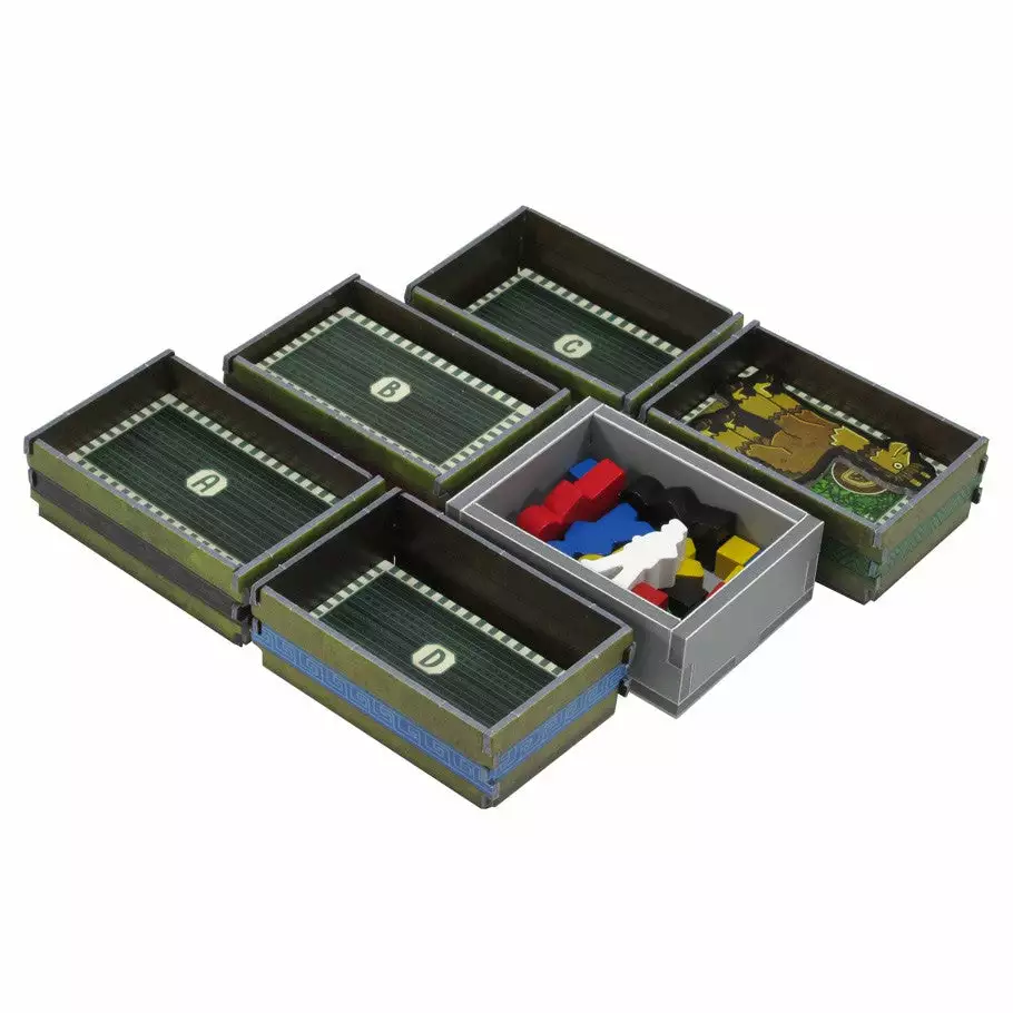 Insert compatible with Altiplano®, and The Traveler® expansion. The design provides both efficient storage and improved game play. Many of the trays can be utilised during the game, and they greatly aid set-up and clear-away times. The rules and trading point board act as a lid on top of the trays.