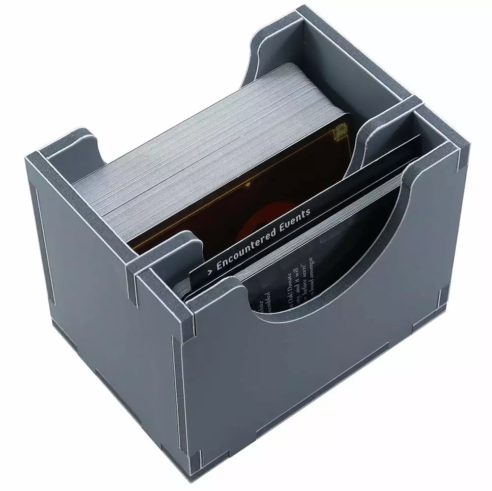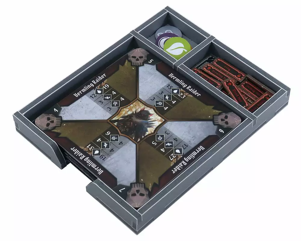 Insert compatible with Gloomhaven: Jaws of the Lion. The design provides both efficient storage and improved game play. Many of the trays can be utilised during the game, and they greatly aid set-up and clear-away times. The insert is arranged in three layers.