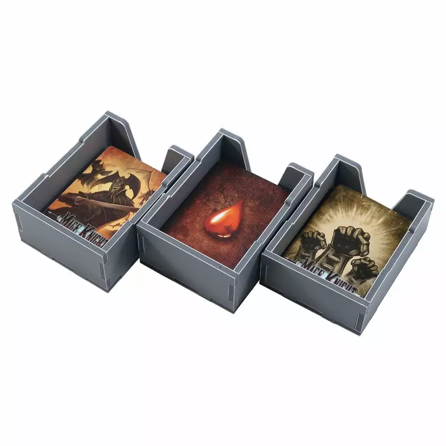 This insert is designed to be compatible with Mage Knight Board Game, and the Shades of Tezla, Krang Character and The Lost Legion expansions. The design provides both efficient storage and improved game play. Many of the trays can be utilized during the game, and they greatly aid set-up and clear-away times. The board and rule books act as a lid on top of the trays.