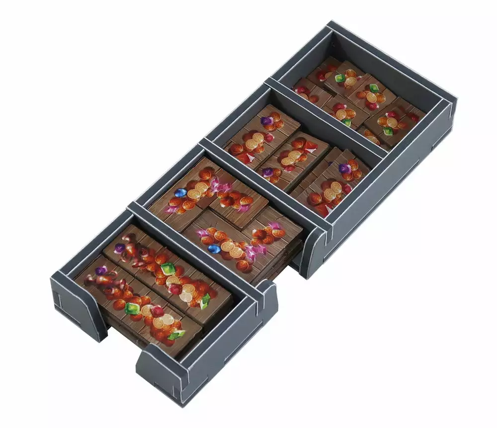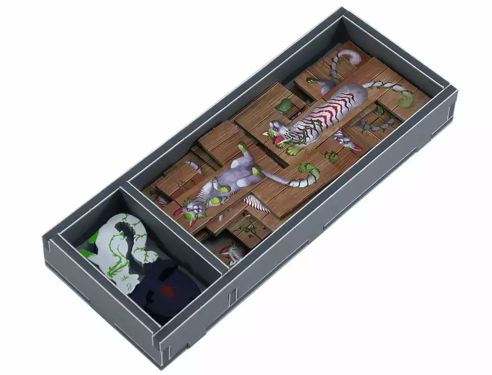 Insert compatible with The Isle of Cats®, including the Late Arrivals® and Kickstarter Pack® expansions. The design provides both efficient storage and improved game play. Many of the trays can be utilised during the game, and they greatly aid set-up and clear-away times.
