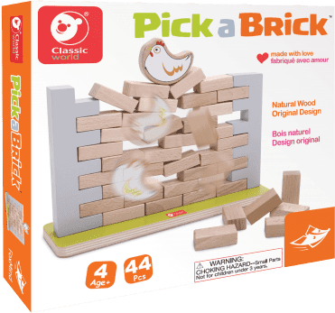 Players take turns picking bricks and removing them from the wall. But be careful not to make the wall collapse as the nesting hen will tumble to the ground. Pick your brick wisely for if you choose the wrong brick and remove it too briskly the hen will fall and you will lose the game. Pick a Brick is a fun and smart game for all ages for 2-4 players.