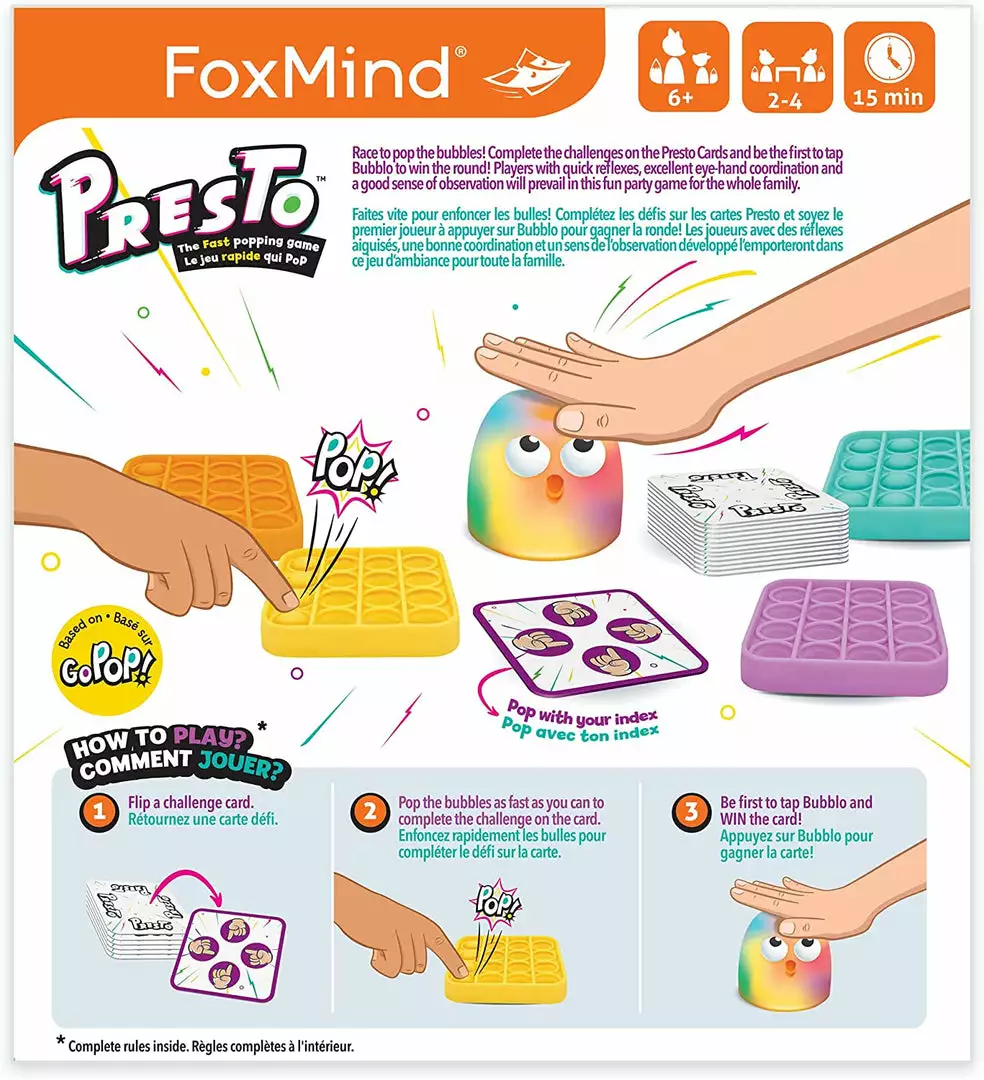 Introducing Bubblo! The cute bubble character from the Go PoP line. Race to pop the bubbles! Complete the challenges on the presto Cards and be the first to tap Bubblo to win the round! Players with quick reflexes, excellent eye-hand coordination and a good sense of observation will prevail in this fun party game for the whole family.