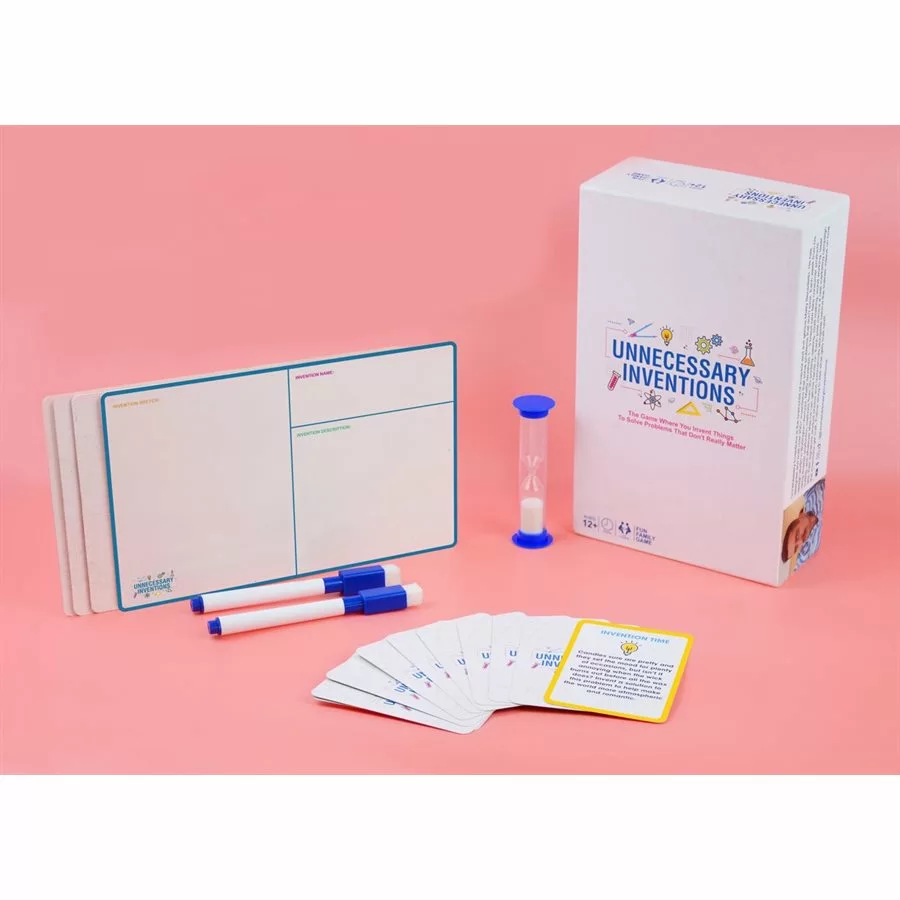 Unnecessary Inventions, a game inspired by the hit social media sensation, challenges players to come up with creative innovative (and ridiculous) solutions to common, everyday problems (that most people don’t really care about). Be the player with the most invention cards at the end of the game to win the top spot.