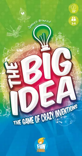 Designer James Ernest released The Big Idea through his own Cheapass Games in 2000, with the game being a hybrid of party game and light strategy game. In that design, players would create crazy inventions from the pairing of an adjective and noun card in their hands, simultaneously choose one invention (other than their own) to invest in, pay to invest in other inventions (whether newly created that round or an earlier creation), then roll a die for each investment to see whether it pays off and if so by how much. The player who collected the most money won.