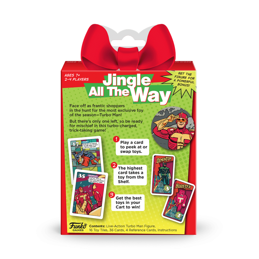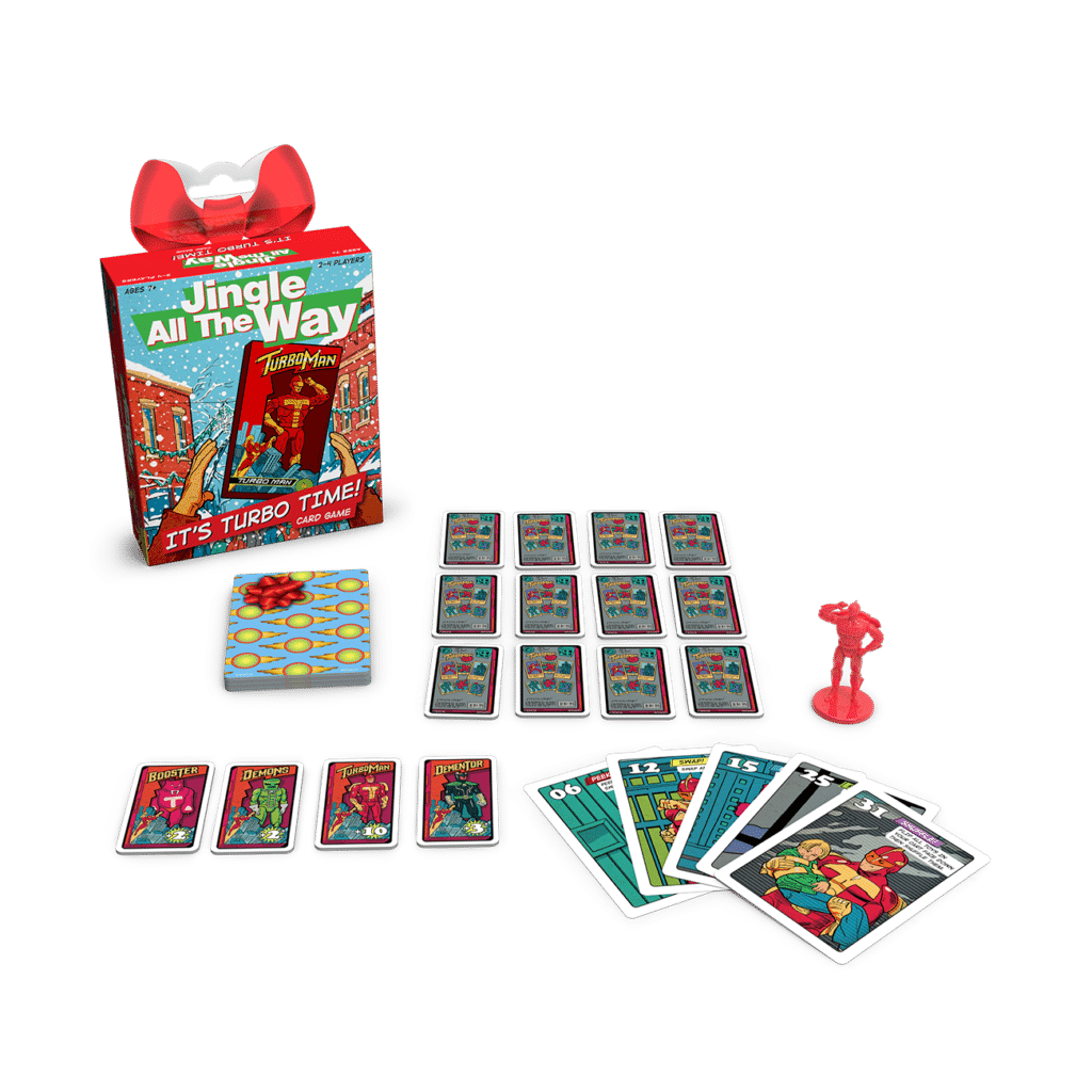 Face off as frantic shoppers in the hunt for the most exclusive toy of the holiday season—Turbo Man! But there’s only one left, so be ready for mischief in this turbo-charged, trick-taking game! Based off the iconic ’90s movie, this game has you peeking, at, flipping, shuffling, and swapping tiles to get the best toys. Will you search for toys on the shelf or wait for another player to find the prize before snatching it from their cart? Fill your cart with the best toys to win!