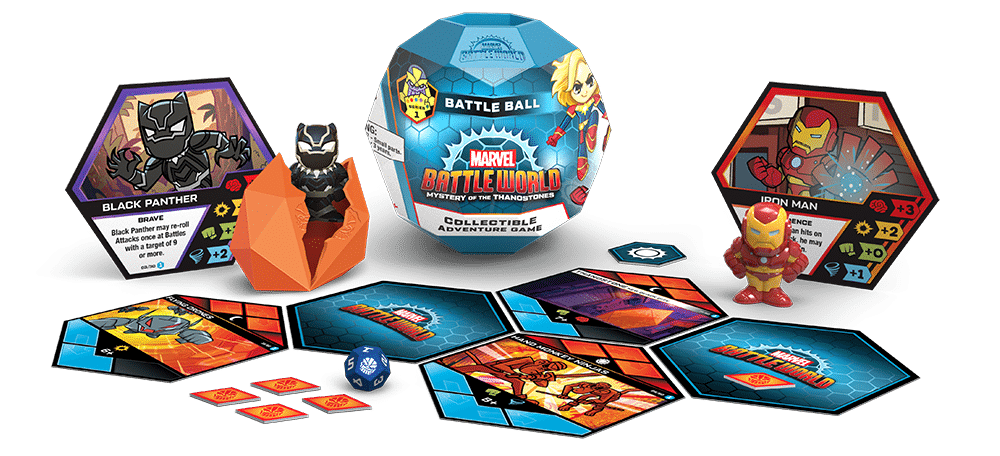 Pick your favorite Hero, rescue your friends, and win battles to defeat Thanos! Battleworld is a revolutionary cooperative, expandable, collectible adventure game featuring dozens of characters from all over the Marvel Universe! Players get to crack open the mysterious Thanostones during the course of play to reveal the mystery character inside for a constant sense of surprise and delight! Choose your favorite hero, and use their unique special abilities. Roll to attack and win three battles to achieve victory!