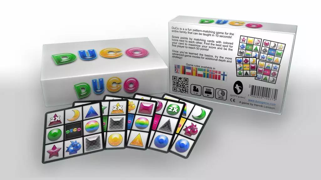 In DuCo, players score points by playing cards so that colored icons lie next to one another. If you match color or shape, you score; match both, and you score more; match special symbols, and the bonus points will roll in. Some icons will match any color or shape, giving you more opportunities to score. The options for where to play grow each turn, and the first player to reach 50 points wins!