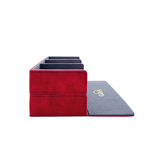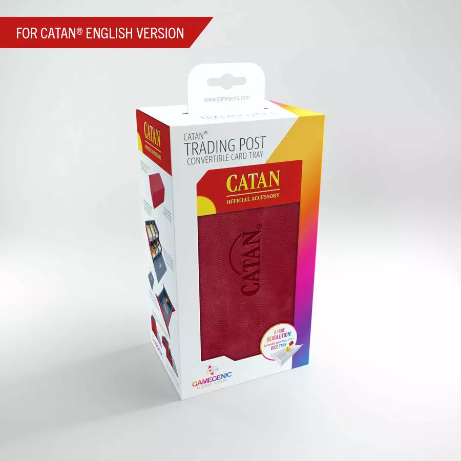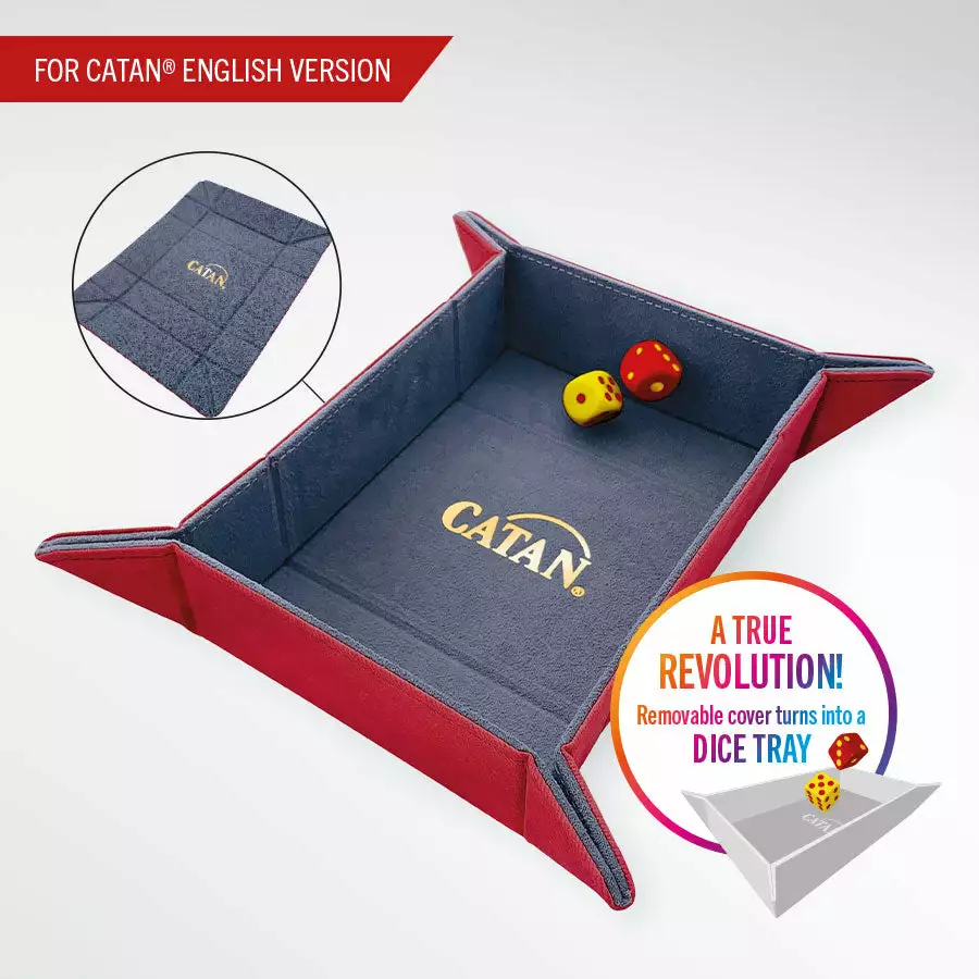 The compartments are designed to hold enough cards for the CATAN base game and 5-6 player extension. The cover of the Trading Post is fully removable and can be easily converted into a rigid dice tray. It is made from premium materials such as Nexofyber and soft inner microfiber lining. This protects the stored cards and provides a smooth sound for dice rolling. Strong magnets will keep this box safely closed, even when it is full.