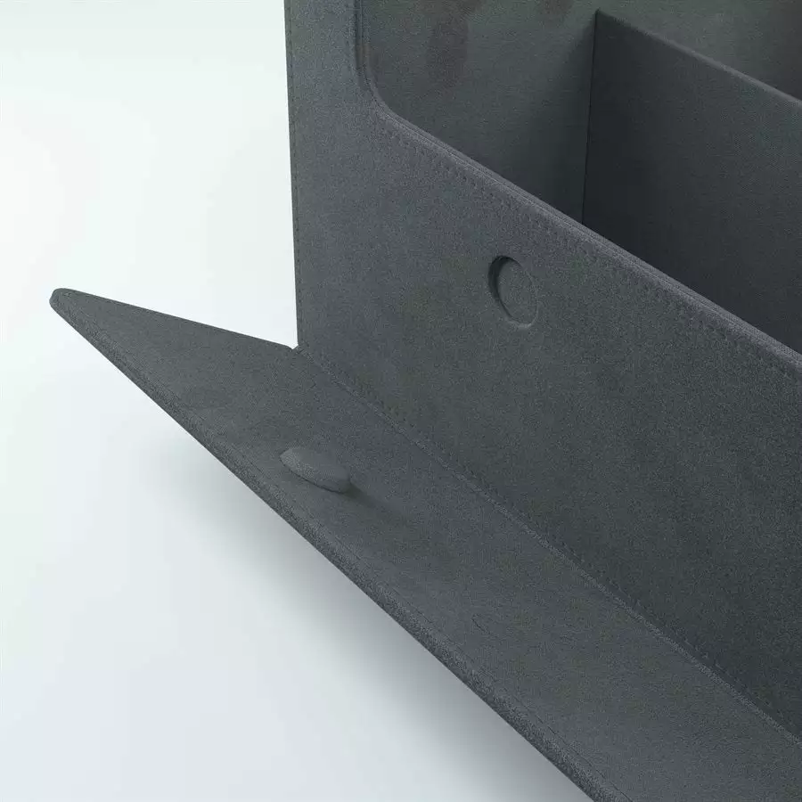 The Dungeon is ideal for housing a complete card collection. It holds several deck boxes, playmats, accessories and, of course, a huge number of single cards (even protected in bigger toploader sleeves). The closing mechanism is subtle but strong thanks to an ingenious design that keeps the box safely closed even when it is fully loaded.
