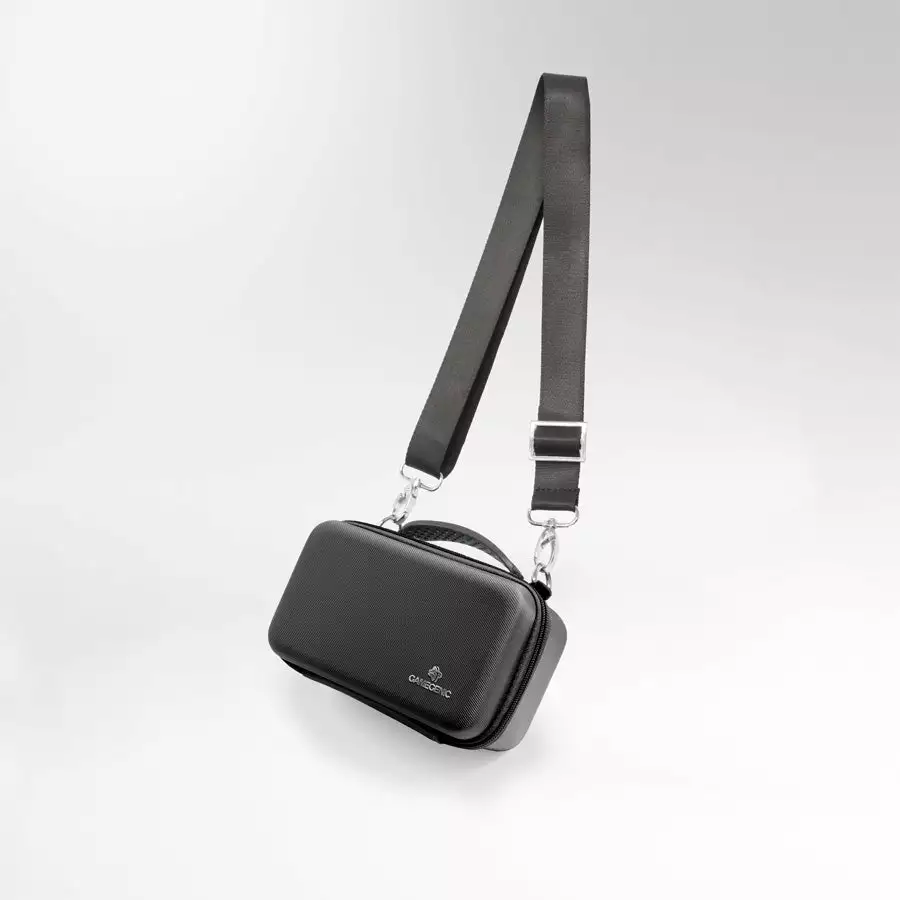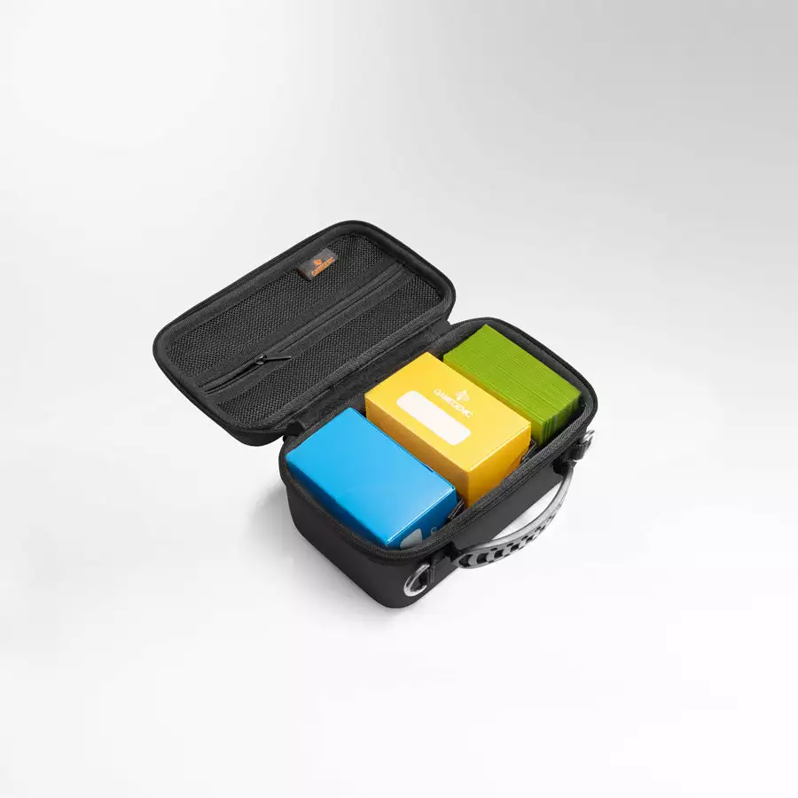 The Game Shell is a portable case, perfectly sized for a wide variety of usages. It fits up to 250 double-sleeved cards, tokens, dice or even complete small games. The outside material comes in durable and resistant nylon with a premium structure. It boasts a reinforced handle and two zippers, hidden and protected by the outer material. On the inside, the Game Shell provides an accessories compartment and two adjustable dividers. This enables a completely free setup, adjustable to your needs and preferences.
