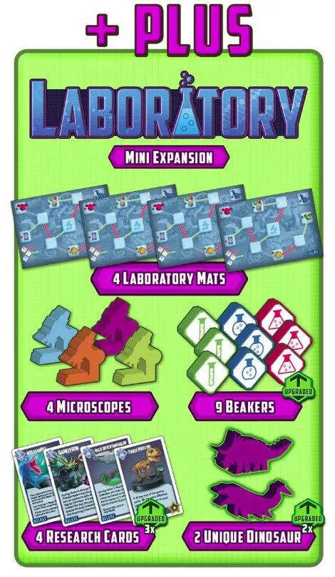 The Laboratory Mini Expansion introduces certain rewards to players during play, like extra dinosaurs, resources, or research cards. To unlock these rewards, players follow research paths marked on their Laboratory Mats.